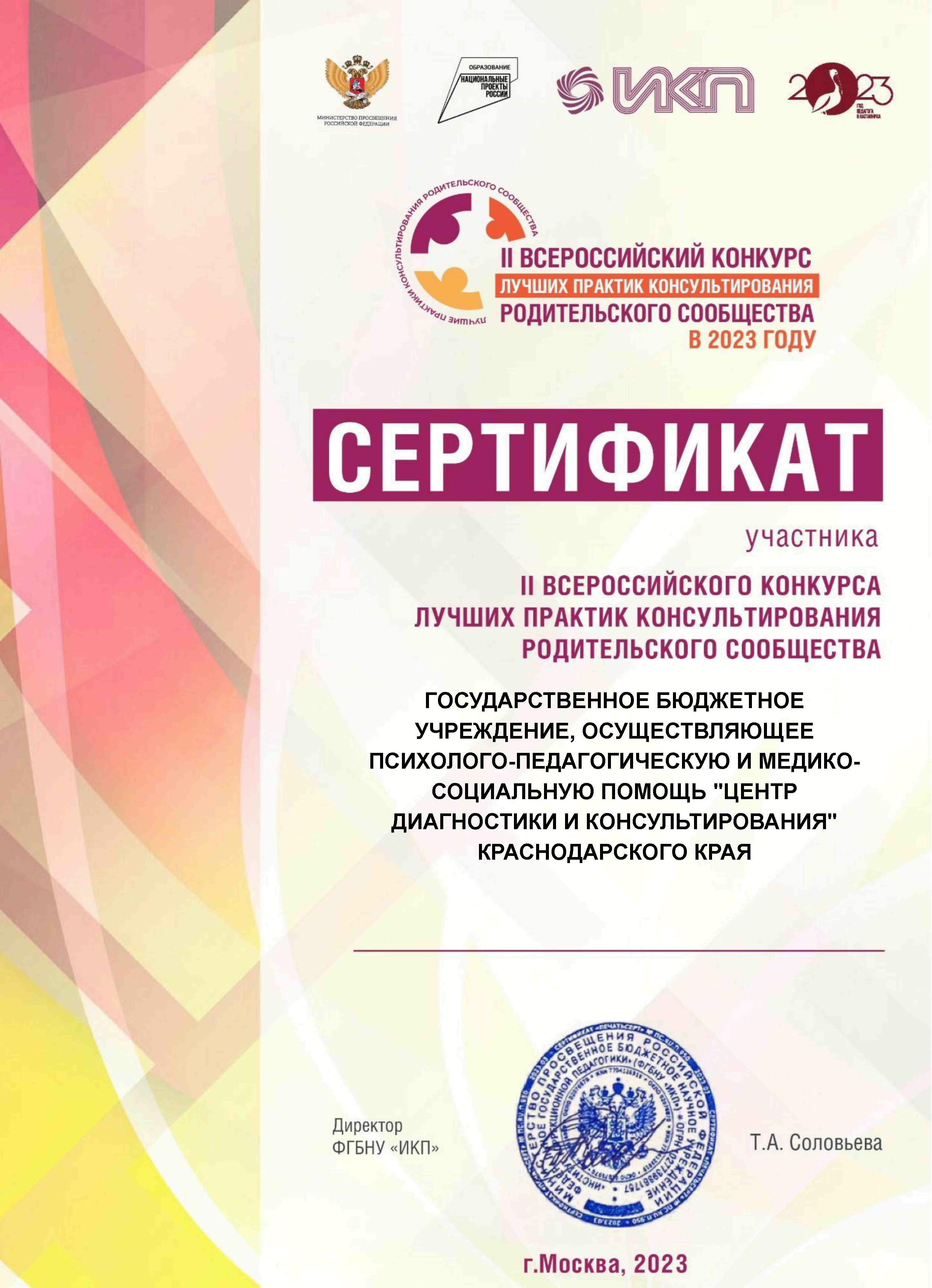 ГБУ «Центр диагностики и консультирования» КК принял участие во II Всероссийском конкурсе лучших практик консультирования родительского сообщества в 2023 году. 1 декабря 2023 г., в г. Москве в Институте коррекционной педагогики состоялась торжественная церемония объявления итогов и награждения участников и победителей конкурса.