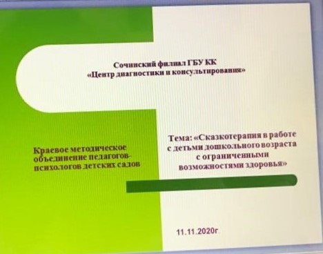 11 ноября 2020 года Сочинским филиалом ГБУ КК «Центр диагностики и консультирования» в режиме онлайн было проведено методическое объединение педагогов-психологов дошкольных образовательных организаций по теме: «Сказкотерапия в работе с детьми дошкольного возраста с ограниченными возможностями здоровья». В рамках мероприятия свой опыт представили педагоги-психологи дошкольных образовательных организаций г.Сочи: Елена Владимировна Кожевникова (МДОБУ центр развития ребенка – детский сад №19), Гусаченко Алла Алмасбековна (МОБУ гимназия №6), Ижикова Надежда Евгеньевна (МДОБУ детский сад комбинированного вида №49), Бойко Татьяна Николаевна (МДОБУ детский сад №105). Участники обсудили особенности применения методов сказкотерапии в работе с детьми с ОВЗ, познакомились с опытом использования метафорических карт, элементов сказкотерапии в работе с детьми с ЗПР, ОНР. Проанализировали возможности применения техник сказкотерапии в работе с детьми с ограниченными возможностями здоровья в условиях групп общеразвивающей и комбинированной направленности. В работе методического объединения участвовало 33 специалиста. |