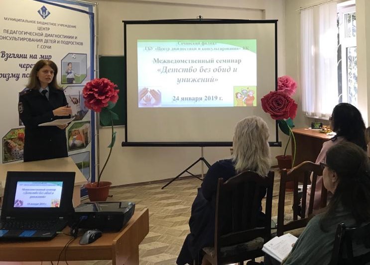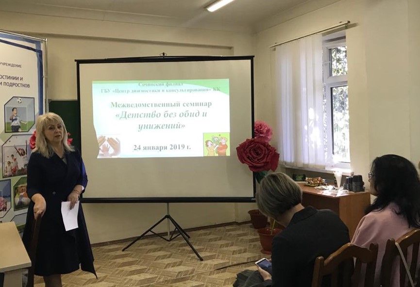 24 января 2020 года в Сочинском филиале ГБУ «Центр диагностики и консультирования» КК был проведен межведомственный семинар для 30 социальных педагогов общеобразовательных организаций города на тему: «Детство без обид и унижений». Семинар проводился под руководством модератора Сергиенко Елены Александровны, руководителя Сочинского филиала ГБУ «Центр диагностики и консультирования» КК.